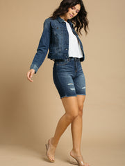 OUR SEXY HI-RISE BERMUDA, VINTAGE INSPIRED BIKER SHORT. A GREAT PIECE TO HAVE IN YOUR WARDROBE, YOU CAN DRESS UP OR DOWN. THE BERMUDA HAS A SUPERIOR CHEEKY FIT, A RAW HEM DETAIL, NO GAP WAISTBAND, AND CLASSIC 5 POCKET STYLING.